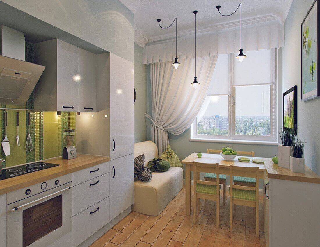 В этом случае лучше всего отдавать предпочтение угловой модели дивана, и расположить его у противоположной гарнитуру стенки. В итоге у вас получится стильный и в то же время оригинальный декор.