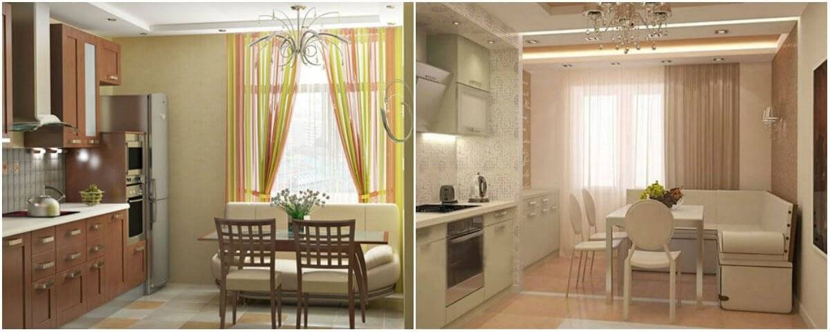 Подобная планировка очень эффектно будет смотреться и на маленькой кухоньке, и в случае, если это дизайн кухни 15 кв м с диваном или мягким уголком. Стол с компактным диванчиком можно поставить вдоль торцевой стены, где чаще всего находится окно. Такое размещение выгодно расширит пространство рабочей зоны, а для обеденной зоны не потребуется дополнительное освещение.