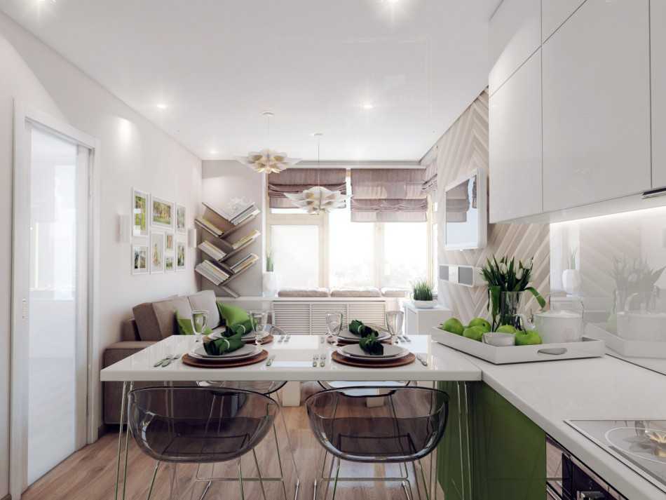Основной цвет в дизайне маленькой кухни – белый, что делает ее визуально просторнее. Обеденный стол складывается в целях экономии места. Его столешница из натурального дерева смягчает строгую стилистику отделки и делает кухню уютнее.