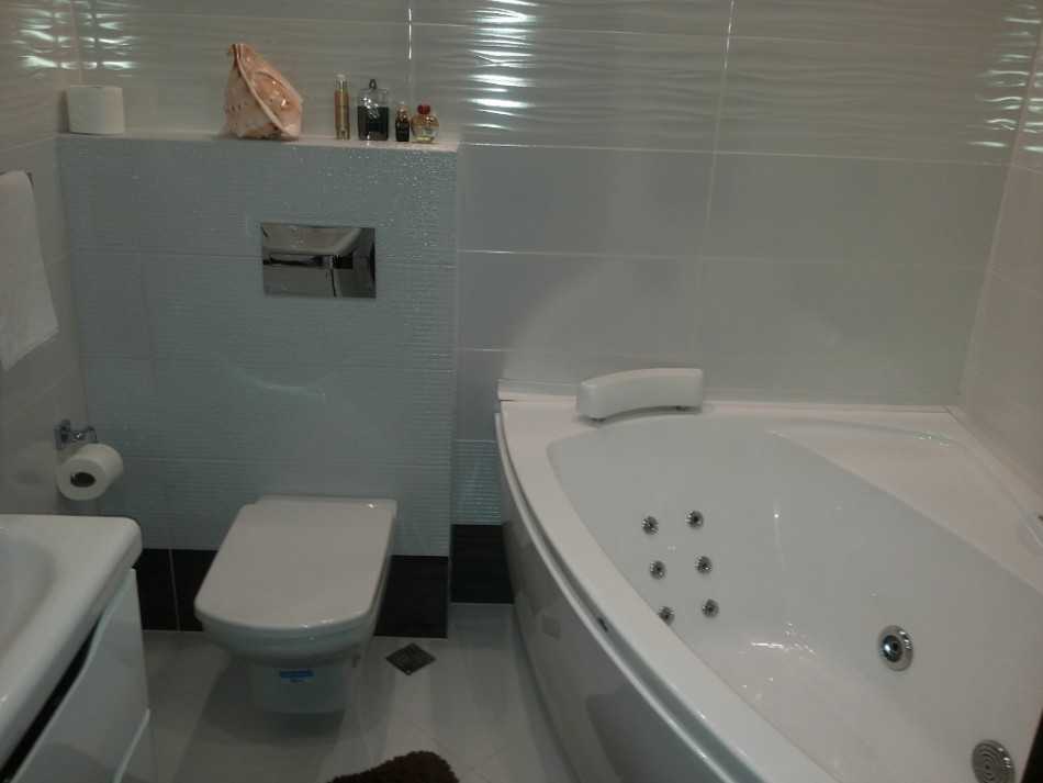 На фото представлена перепланировка раздельной ванны и туалета в совмещенное помещение со всеми удобствами