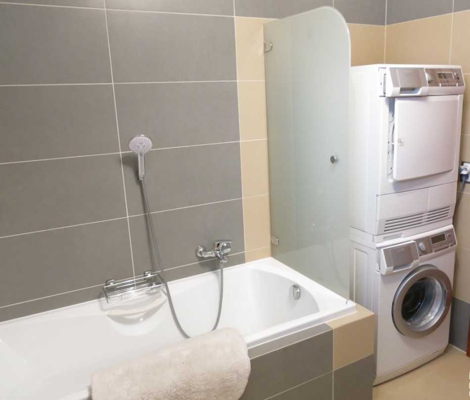 2-ой стандарт — стиральная машина под раковиной в ванной. Это самый практичный вариант т.к. вообще не занимает площади, плюс не нужно делать дополнительный отвод канализации и подвод холодной воды — всё в одном месте.