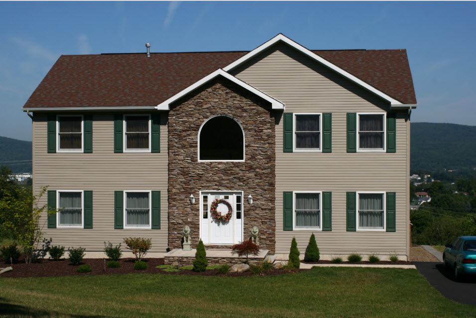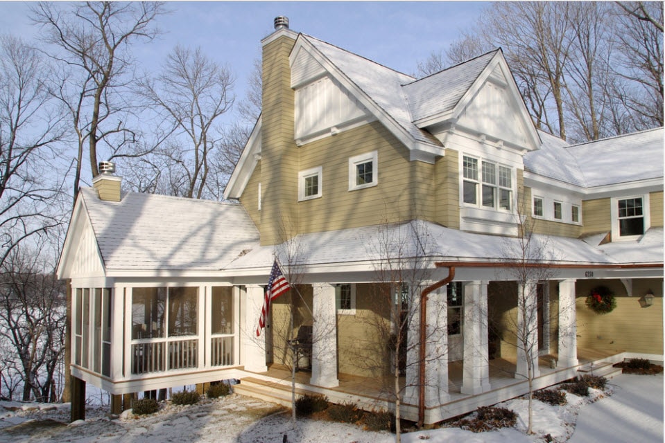 Декорирование такое же, как у общего фасада дома. Интересное сочетание дают соединение различных материалов строительства или отделки: дерево и натуральный камень, кирпичная кладка и декоративная штукатурка, сайдинг разного цвета + фундаментные панели.