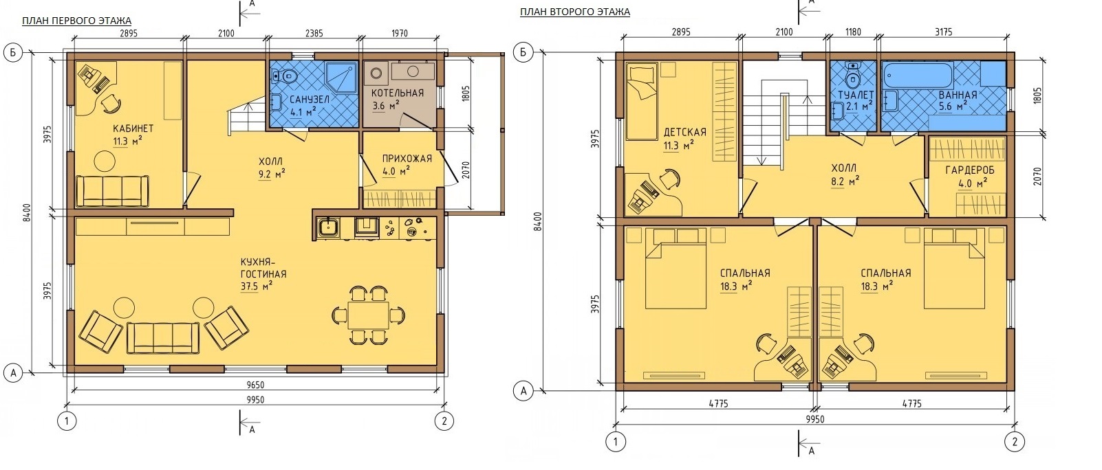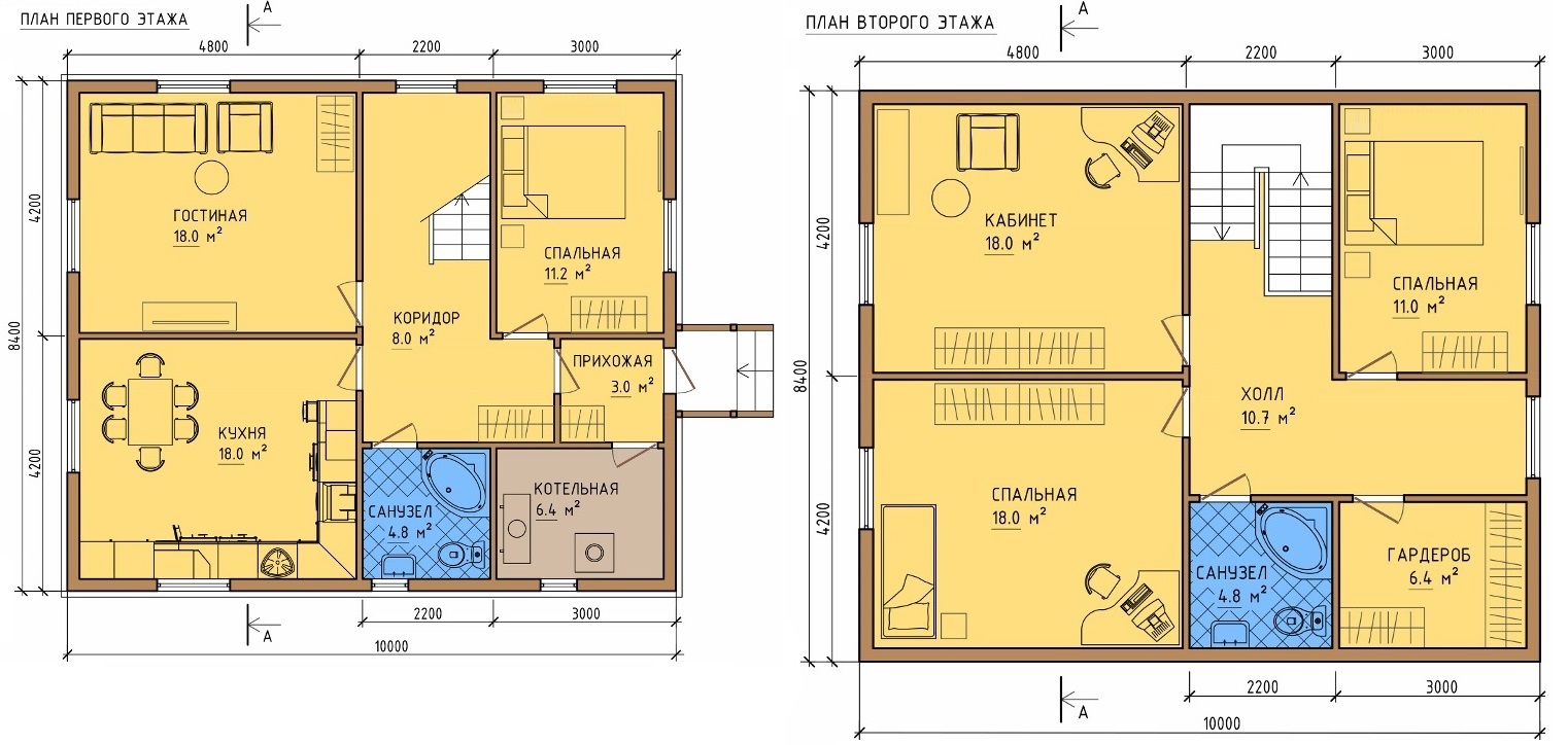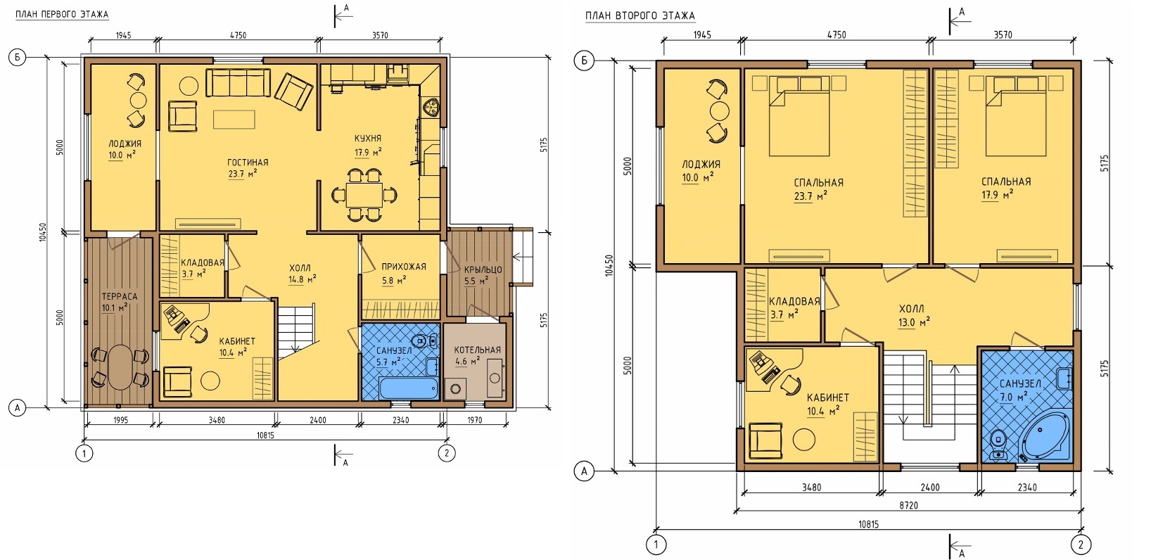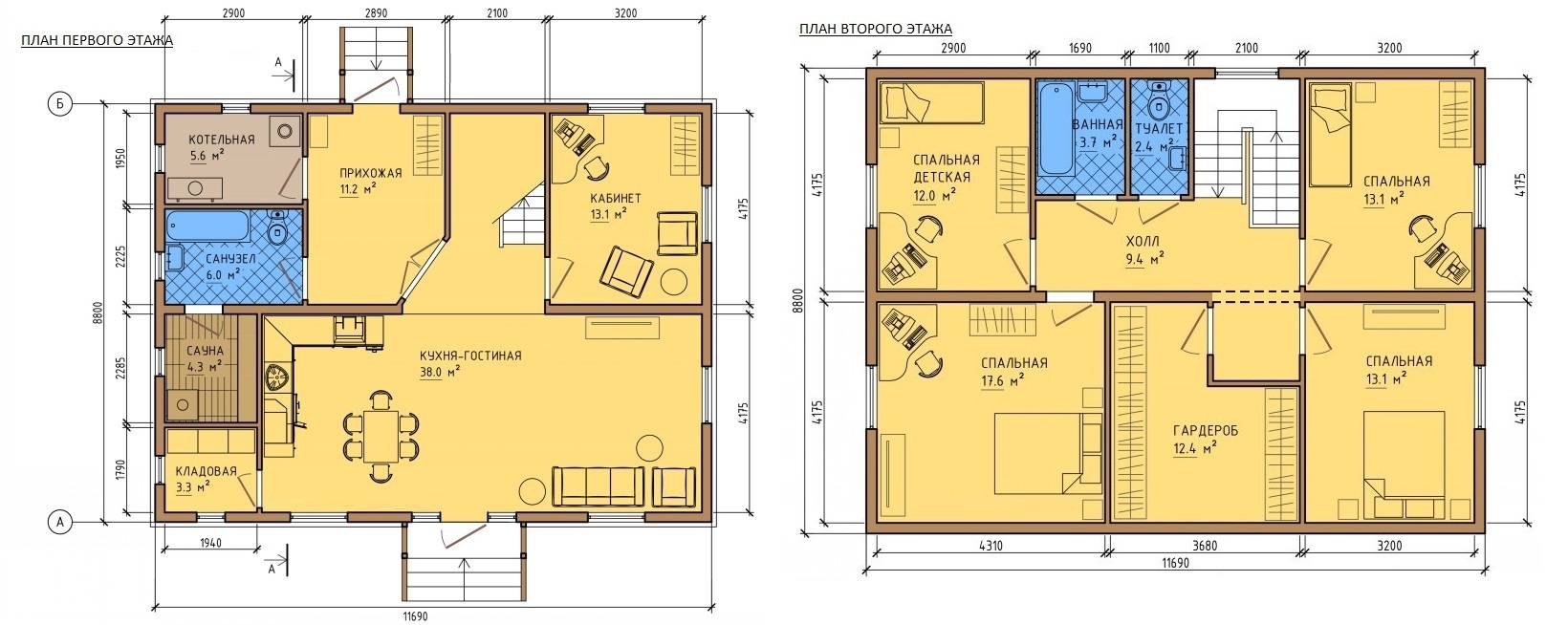 без лестницы, которая ведет на второй этаж, просто не обойтись. Как правило, она занимает от 7-12 кв. метров, в зависимости от самой конструкции. Второй нюанс – возрастная категория жильцов дома. С возрастом подняться на второй этаж будет уже не так легко, как раньше. Но если все-таки дом планируется для пожилой пары, второй этаж благоразумно будет отвести для гостевой спальни. Проект такой двухэтажной постройки должен предусматривать преимущественное расположение основных комнат именно на первом этаже. И еще один немаловажный момент: лестница – пожалуй, самое травмоопасное место;