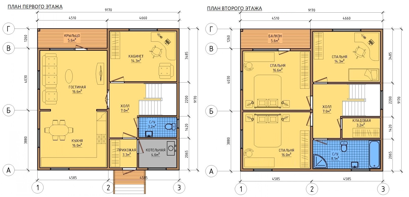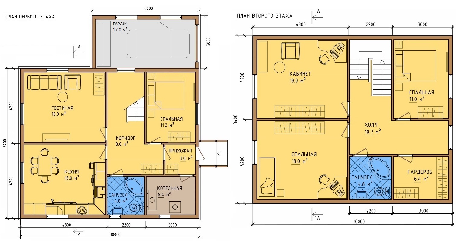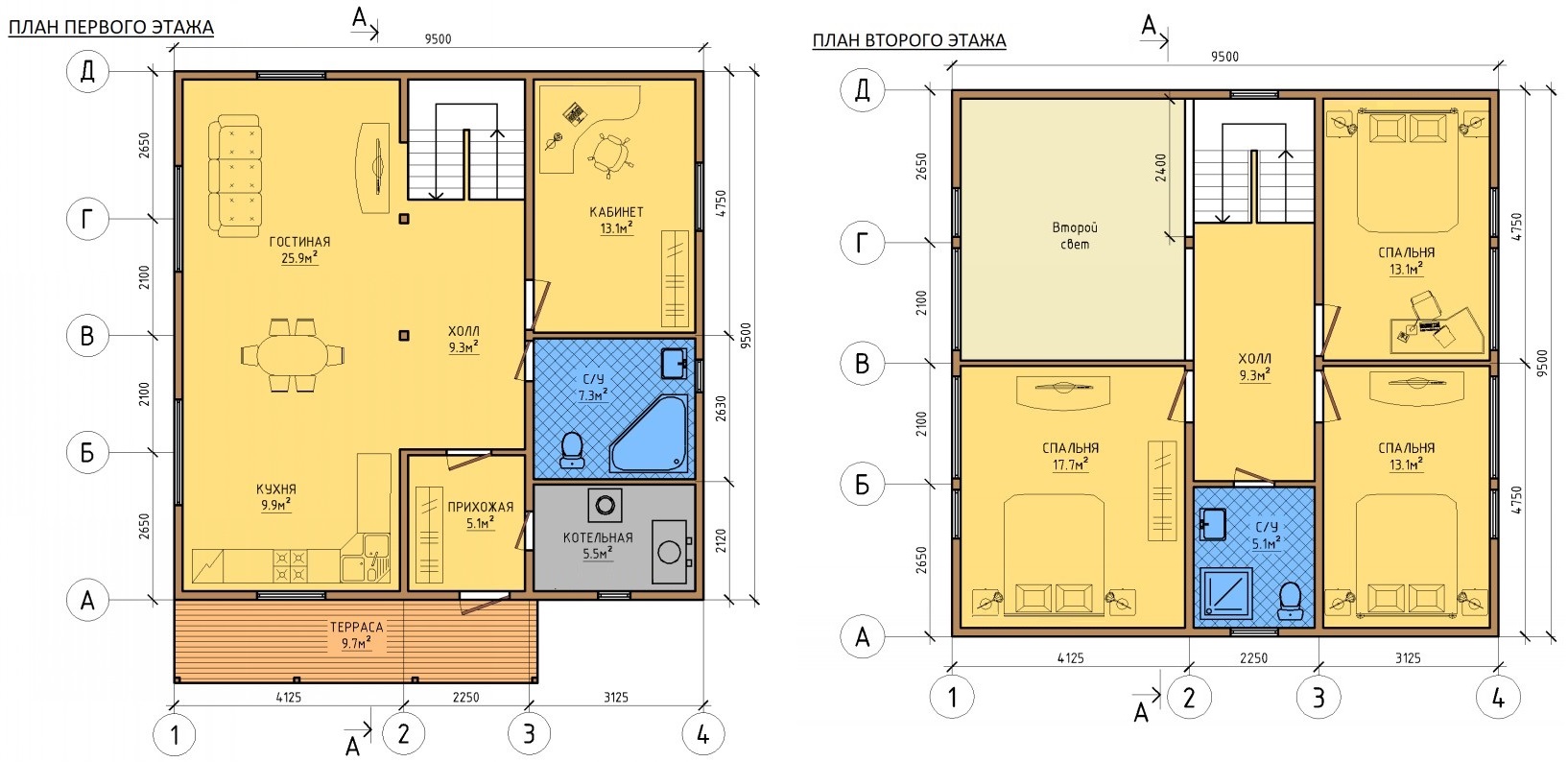 без лестницы, которая ведет на второй этаж, просто не обойтись. Как правило, она занимает от 7-12 кв. метров, в зависимости от самой конструкции. Второй нюанс – возрастная категория жильцов дома. С возрастом подняться на второй этаж будет уже не так легко, как раньше. Но если все-таки дом планируется для пожилой пары, второй этаж благоразумно будет отвести для гостевой спальни. Проект такой двухэтажной постройки должен предусматривать преимущественное расположение основных комнат именно на первом этаже. И еще один немаловажный момент: лестница – пожалуй, самое травмоопасное место;