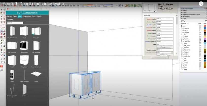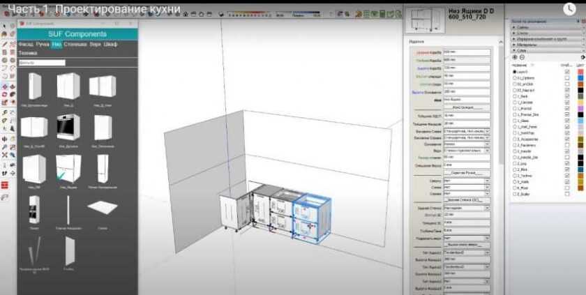 Кухонный же фрагмент представлен отдельной секцией в каталоге готовых элементов и фактур. Плюсом этого продукта служит возможность детальной прорисовки каждого предмета гарнитура в отдельности, что упрощает создание индивидуального проекта. При этом процесс создания кухни на экране напоминает процесс сборки гарнитура по месту. В первую очередь вырисовываются тумбы и шкафы, как верхнего, так и нижнего ряда, потом они наполняются соответствующей фурнитурой и после выстраивания в единую линию, накрываются сверху единой столешницей. Результат может быть выведен в виде трехмерной картинки.