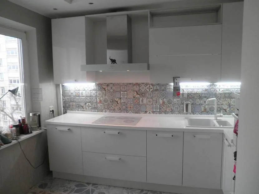 Интерьер оформляется в лаконичном и практичном варианте, с минимумом декора и максимумом функциональности. У набора должен быть глянцевый однотонный фасад, современная техника – встроенная.