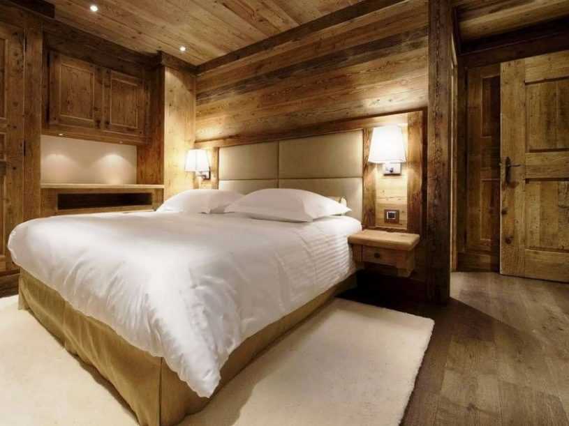 Идеально вписываются в такие спальни деревянные элементы (балясины на потолке в стиле швейцарских шале, отделка прикроватной зоны ламинатом, кофейные столики из поперечного спила и пр.), монохромный текстиль и объемные вязаные пледы из самой толстой пряжи.