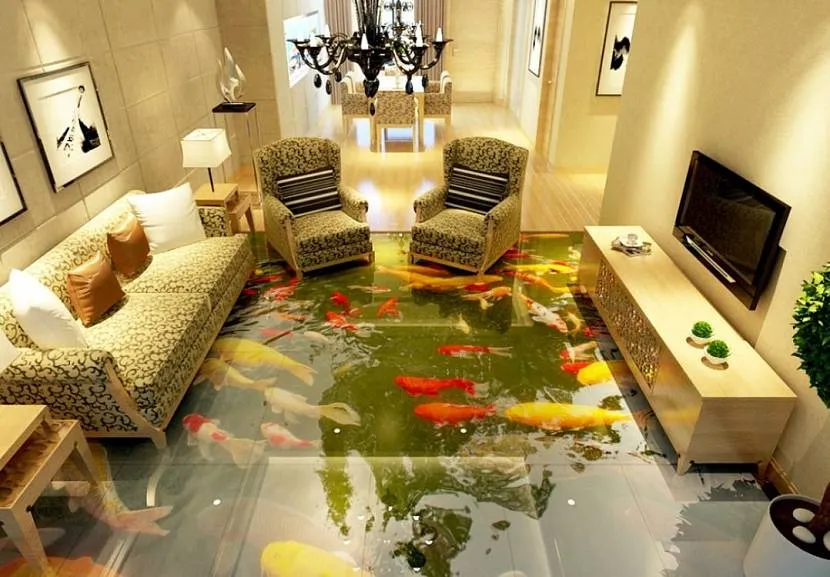 Яркий броский пол может быстро надоесть. Рисунок быстро приедается и начинает «мылить глаза». Вписать его в интерьер очень непросто. Разве что в ванной и туалете вопросы возникают редко. В других помещениях это гораздо сложнее. Подходит заливной пол с рисунком далеко не для каждого типа интерьера. Но 3 D полы вполне могут быть и без рисунка.