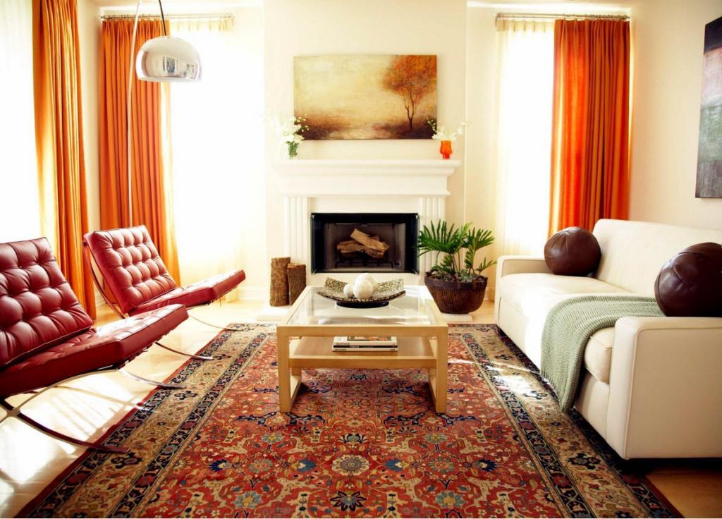 Чтобы понять, как правильно выбрать ковер в гостиную, необходимо следовать некоторым правилам. Ноги сидящих должны находится на ковровом покрытии, а не на полу. Именно поэтому можно расположить несколько маленьких ковров возле дивана и кресел — или закрыть весь участок небольшим плотным ковром.