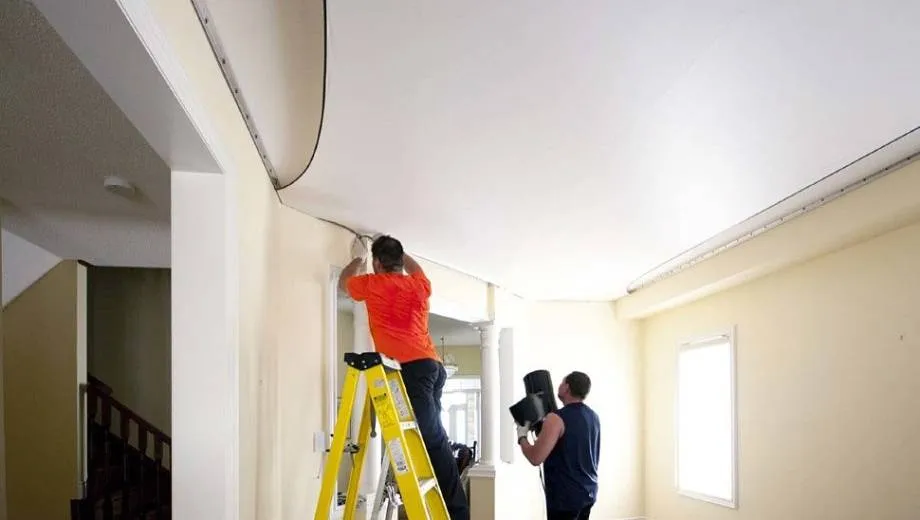 Натяжной потолок – уникальная конструкция, монтаж которой производится в последнюю очередь. Работа эта чистая, если вы подготовили поверхность заранее и установили багеты, каркас. После этого остается лишь натянуть само полотно. Если вы выбрали пленку ПВХ, рекомендуется дать обоям полностью высохнуть, чтобы исключить их отклеивание в процессе нагревания тепловой пушкой.