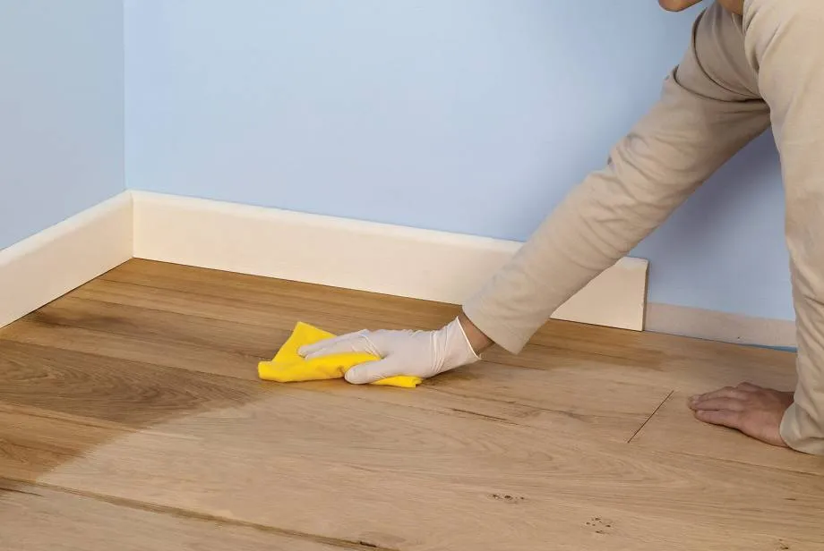 - После полного снятия покрытия постарайтесь избавиться от остатков клея на полу, опять же с помощью растворителя. Делать это нужно быстро, поскольку растворитель легко испаряется. В заключение тщательно протрите очищенную поверхность.