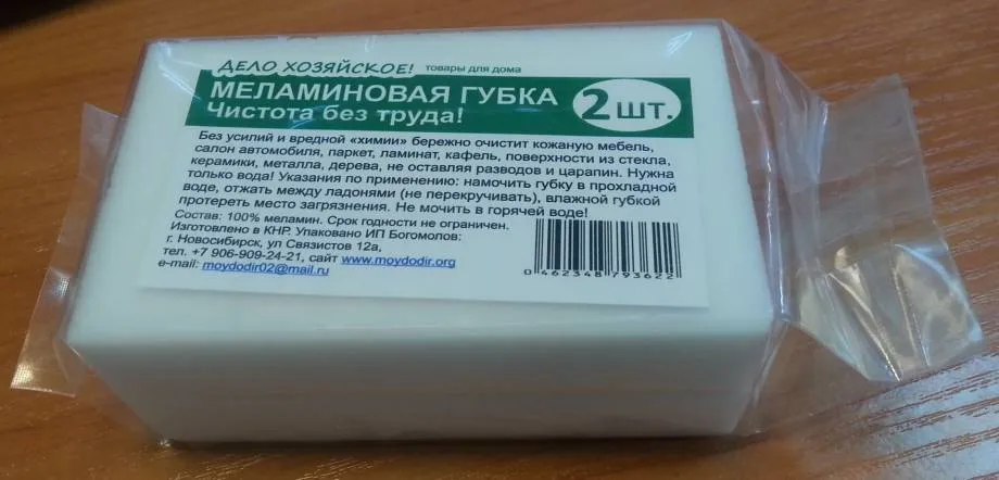 - Меламиновую губку. Нужно потереть ею место загрязнения. Использовать можно сухую или влажную губку. Губка из меламина является довольно эффективным средством, но при неправильном использовании может быть токсичной.