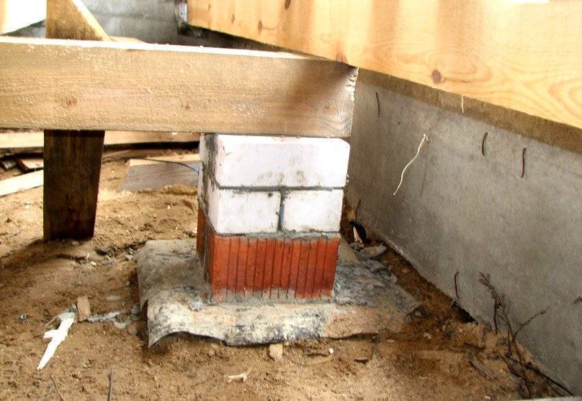 Подпорки для лаг могут быть из кирпича, бетона или металлические