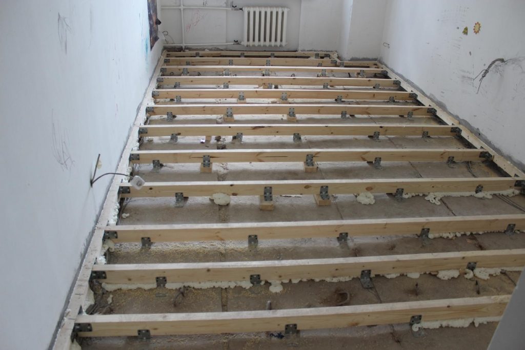 - на подготовленную таким образом поверхность выполняется укладка лаг, при этом расстояние между соседними брусьями зависит от материала чистового пола (доски, фанера);