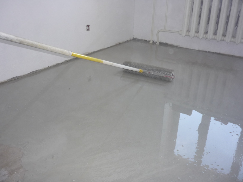 После того, как раствор окончательно заполнил площадь пола, важно прокатать всю поверхность игольчатым валиком, чтобы удалить пузырьки воздуха