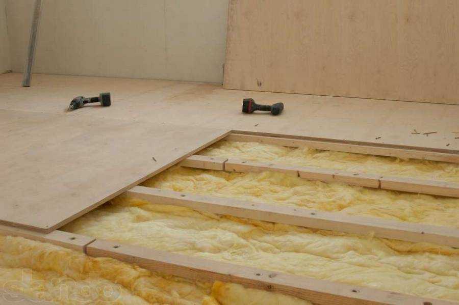 - Пространство между лагами заполняется утеплителем и звукоизоляционным материалом. Все коммуникации необходимо проложить до укладки фанерных листов.