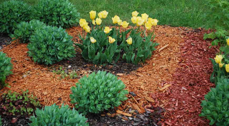 Мульча крупной фракции. Некоторые используют яркую мульчу для окантовки посадок. Это достигается путем удаления травы с внешних краев грядок, бордюров и дорожек, а затем заполнения их мульчей. Такой тип ограждения обеспечивает гибкость в случае, если существующая площадь со временем изменяется по размеру или форме. Используя кору крупной фракции, не забывайте о защите сада от грызунов — вы ведь им устроите под щепой настоящий спа-комплекс.