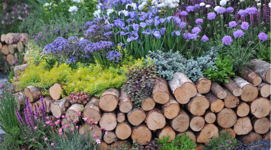 Чтобы сделать такие бордюры для клумб своими руками, нужны бревнышки, которые заостряют с двух сторон. Бревна вкапываются в грунт по периметру, создавая надежное ограждение, предотвращающее разрастание растений или размывание грунта. Но высота частокола не должна быть большой, чтобы он не закрывал вид на посадки.