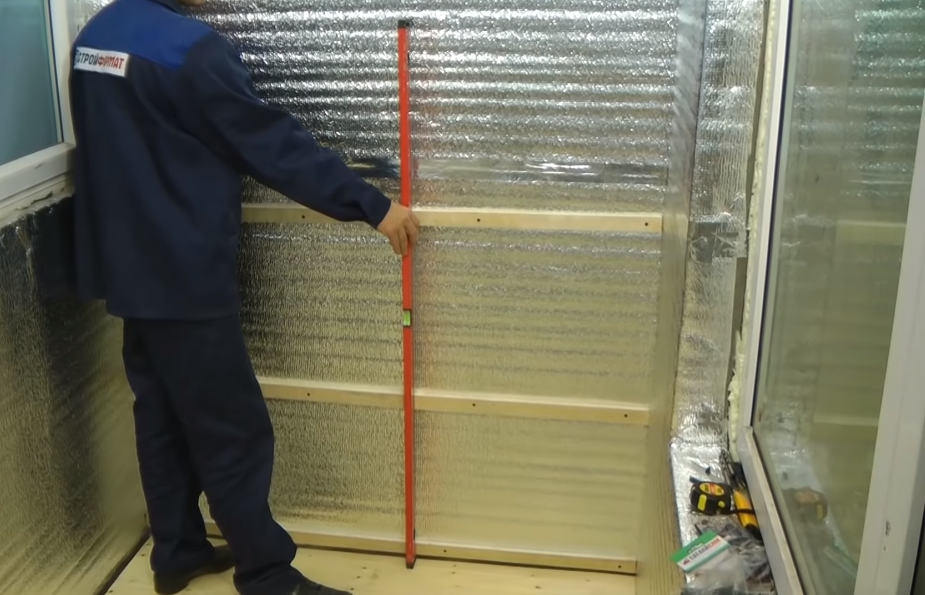 Монтаж каркаса. Бруски располагают перпендикулярно монтируемым панелям. Шаг между элементами обрешетки согласовывают с размерами выбранных изделий. Тщательно контролируют пространственное положение каждого элемента;