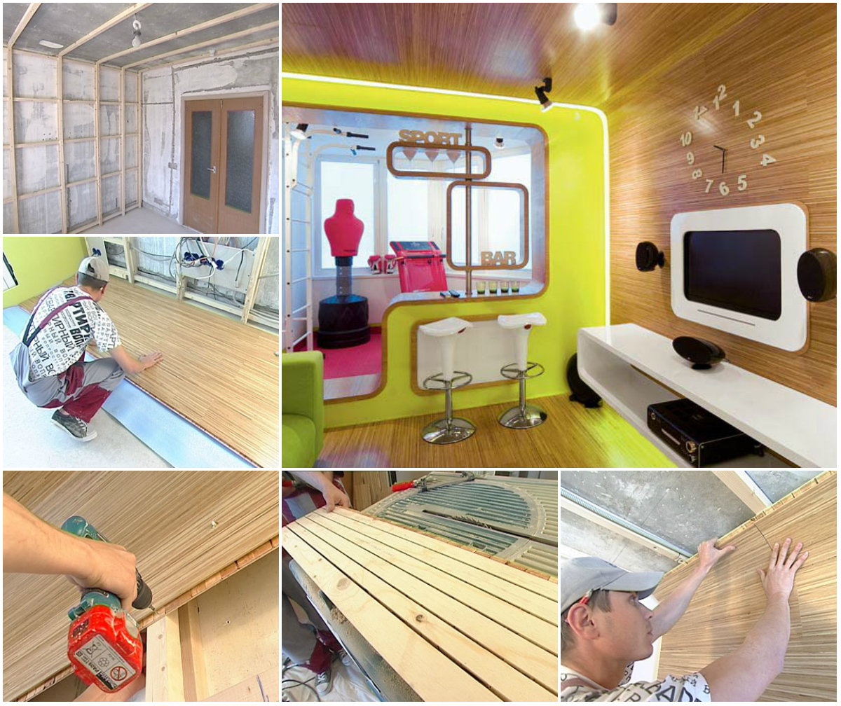 Паркет и стеновые панели устанавливают на обрешётку из бруса или профильный каркас. Некоторые производители предлагают и специальные крепления для надёжной и быстрой фиксации каждого ряда паркета к профилю.