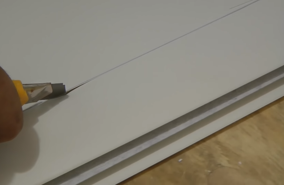 К лицевой стороне приклеивается двусторонний скотч. Удерживая панель за скотч, плиту переносят к месту монтажа. Каждый элемент крепится в правильном пространственном положении. Тщательно фиксируется на основании