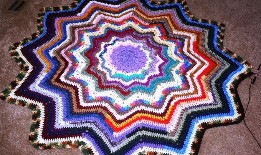 Коврик, выполненный в данном стиле, выглядит необычно. Такое изделие вы сможете связать в виде большой звезды, мы же вам предлагаем изготовить коврик из нескольких маленьких звездочек.