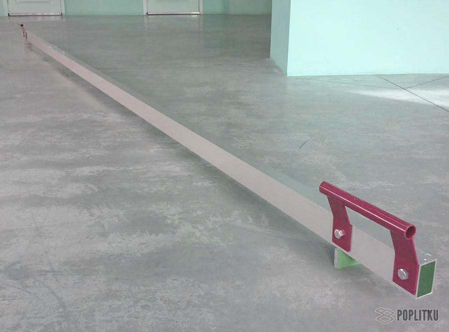 Выравнивание по маякам называется так потому, что сначала нужно установить и зафиксировать металлические рейки, так называемые маяки, затем по их уровню надо выравнивать стяжку. Данный способ позволяет получить ровную и прочную поверхность в больших помещениях даже при значительных неровностях несущего пола. Единственный недостаток заключается в том, что полностью просохнуть стяжка может через 10-30 дней в зависимости от величины неровностей и, соответственно, толщины слоя цементного раствора.