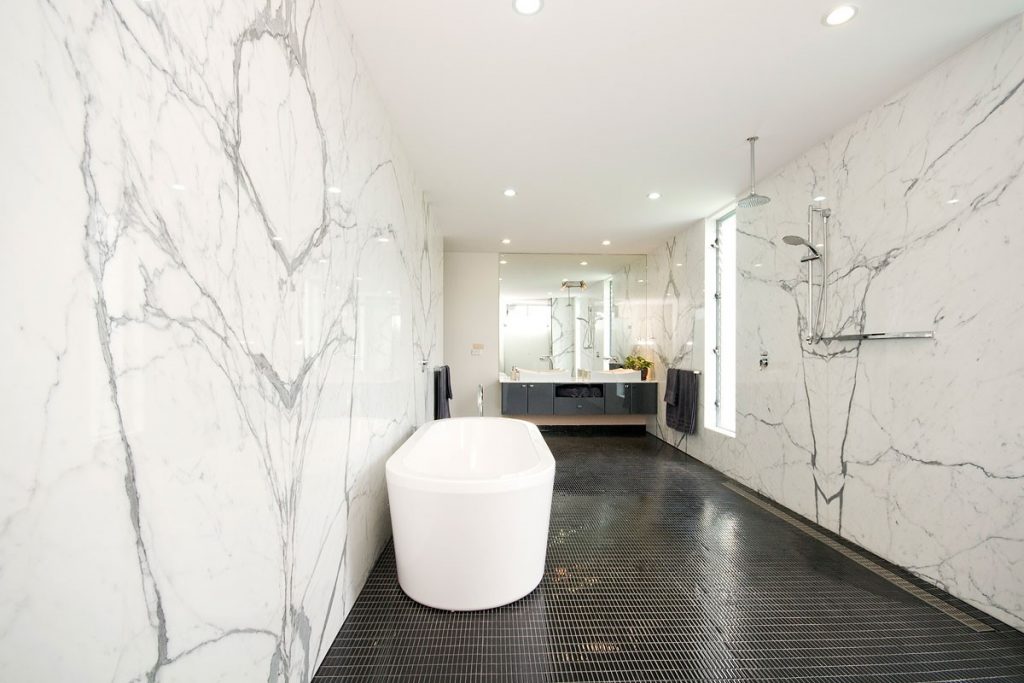 Что касается горизонтальных поверхностей, варианты также разнятся: например, если пол решено делать полностью керамогранитным, почему бы не собрать панно из разных его оттенков? Чтобы спроектировать рисунок понадобится программа, а нарезать плиты — специальное оборудование: но получившийся результат будет 100% уникальным.