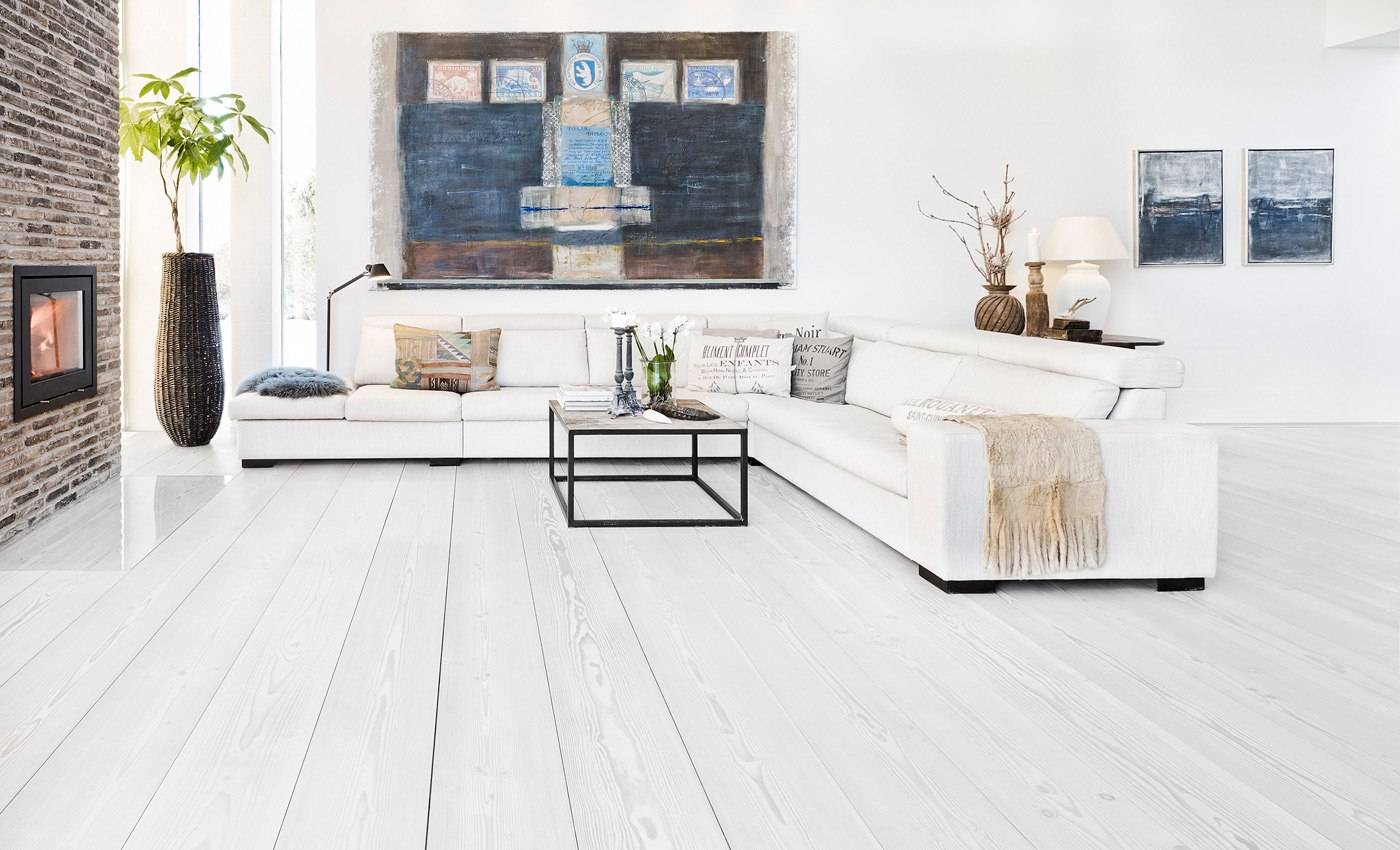 Отбеливание обычно используется для более легких пород дерева, таких как клен, дуб или ясень. Эта процедура выявляет естественную структуру дерева, прекрасно подчеркивает рисунок зерна, благодаря чему пол приобретает благородство. Простые отбеленные доски освещают гостиную, придавая ей скандинавский стиль. Следует помнить, что белый цвет — это целый спектр оттенков: от синего до серого и голубиного до светло-бежевого, поэтому есть много вариантов устройства пола в гостиной.