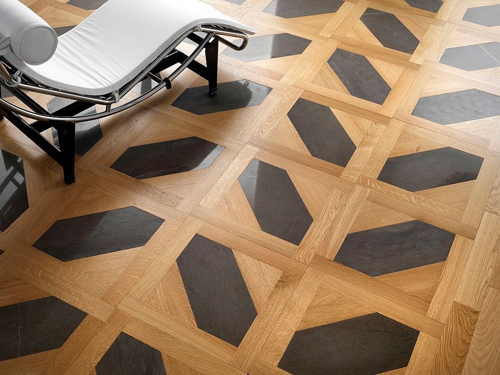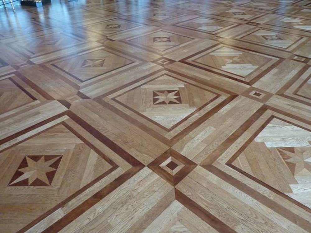 Один из самых дорогостоящих материалов, чаще всего им выстилают полы в крупных гостиницах, музеях, театрах. Для изготовления такого паркета используется несколько сортов дерева разного цвета и фактуры (чаще всего это ольха, клен, дуб). Для каждого помещения составляется индивидуальная схема. Пластины имеют сложную форму, их не только склеивают, но и спрессовывают между собой.