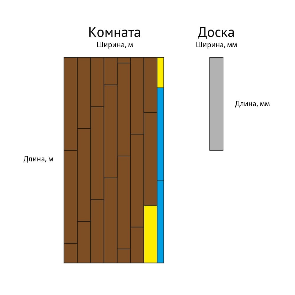 - При прямой укладке, для расчета применяется формула: S (площадь кухни) + 7% (от общей площади, на обрезки).