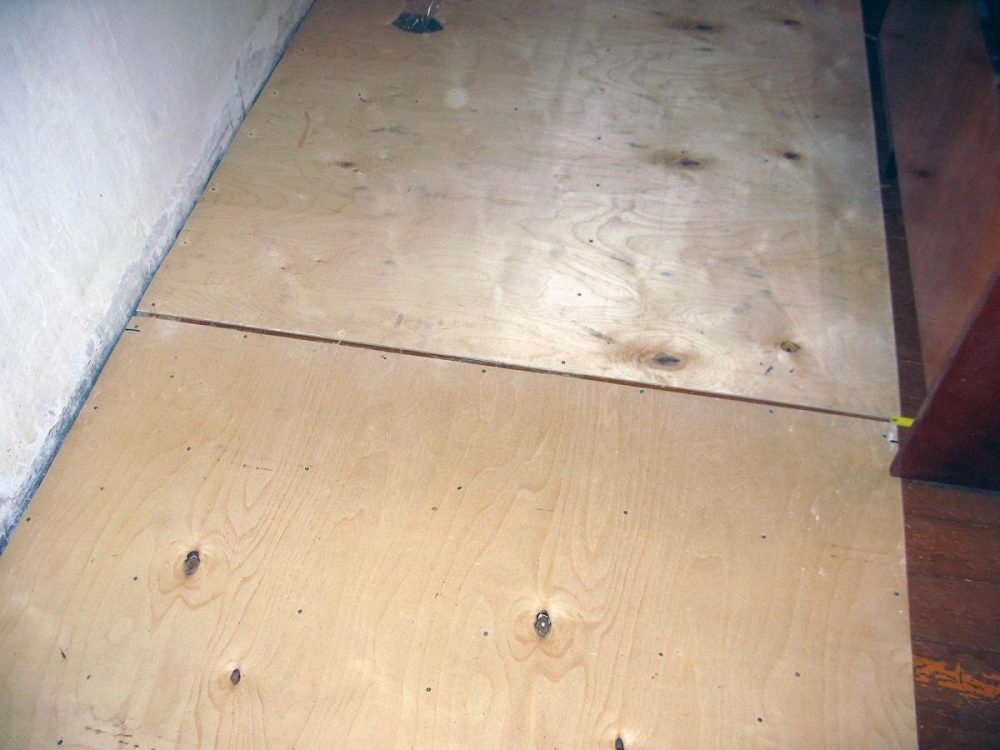 При устройстве фанеры, следует помнить, что данный материал также состоит из природных волокон, что приводит к его разбуханию от контакта с влажной средой. Таким образом, для снижения риска вспучивания ламината, рекомендуется укладывать фанеру с технологическим зазором.
