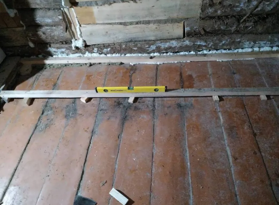 - Значительные провалы половиц – для их устранения потребуется разобрать частично настил до черновой основы. После выравнивания и закрепления лаг посредством саморезов, вся напольная конструкция возвращается на свое место.