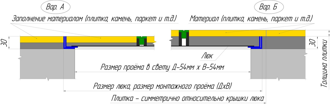 - расположение крышки люка заподлицо с остальным напольным покрытием, отсутствие выступающих над уровнем пола элементов;