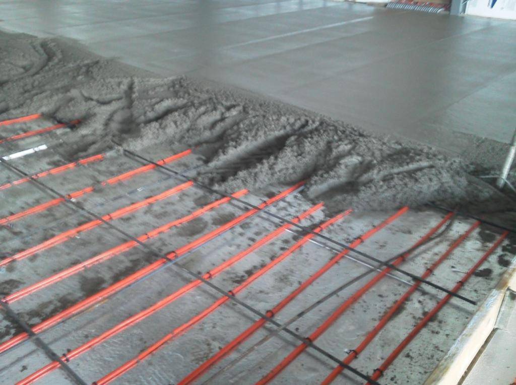 Стяжку заливают после подключения и тестирования системы, слой над трубами – около 3 см. Для приготовления используют цемент М300 или выше, мытый песок и фракцию щебня до 2 см. Рекомендуемые пропорции: 1/1,9/3,7. Во избежание появления трещин и для упрощения процесса заливки рекомендуется добавлять в раствор пластификатор.