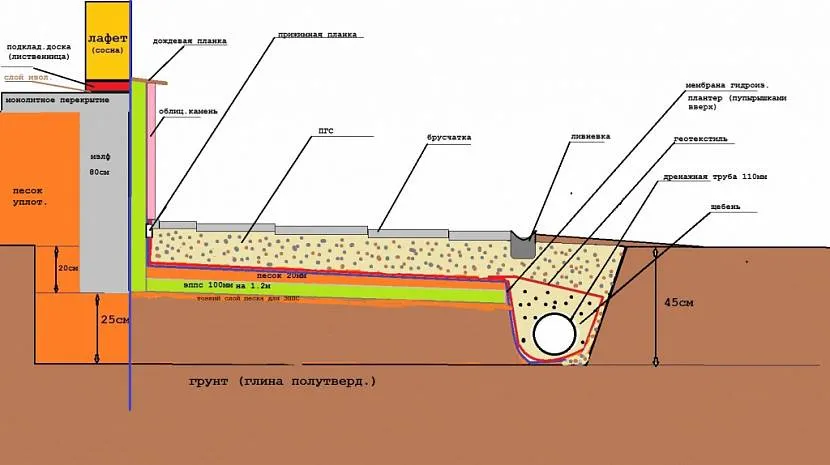 Первый слой создает уплотнение и основание для определенного покрытия, например, асфальтовой отмостки. Данный глиняный слой выполняет главную функцию данного сооружения, это гидроизоляция. Слой делают из глины, щебня, гарцовки или песка.