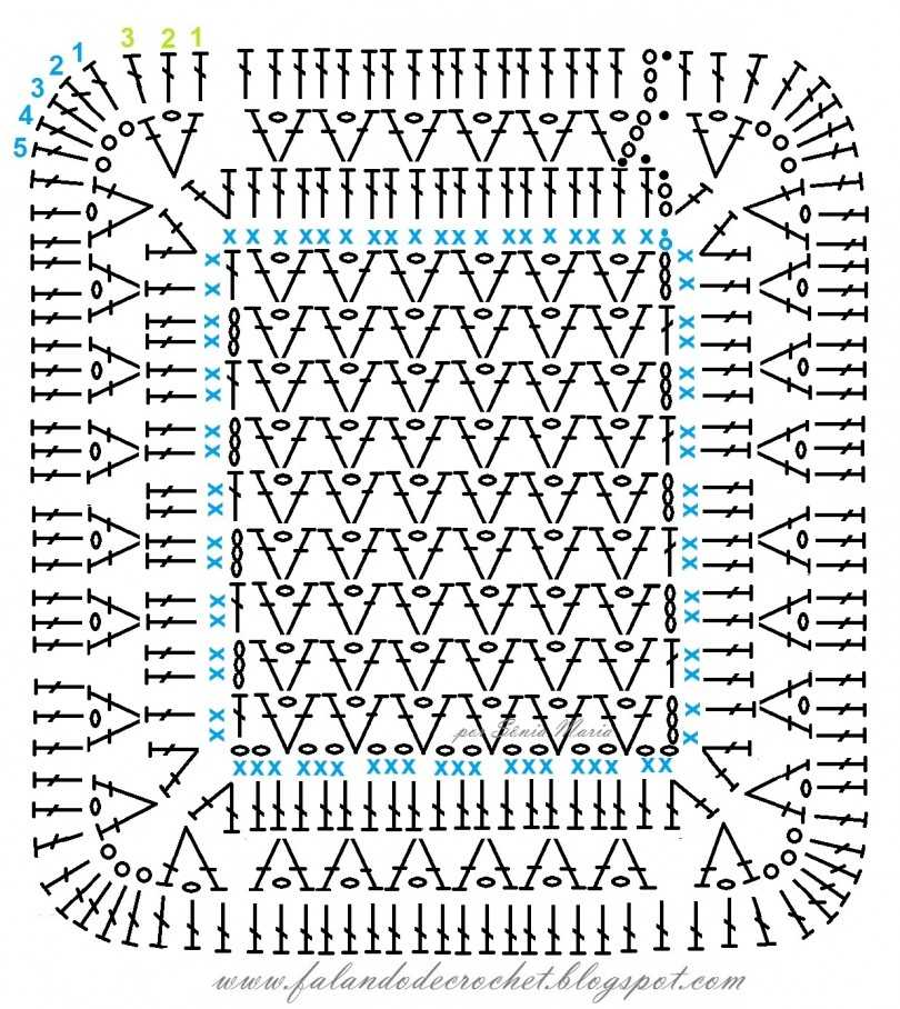 Второй же способ предполагает увеличение размера коврика – начинают вязать по схеме 1 на требуемую величину, а уже потом переходят к схеме 2, представленной выше. Получается, что ажурные «веера» с цепочки воздушных петель плавно переходят на столбики с накидами серединной части. Таким образом, можно «отрегулировать» размеры готового полотна.