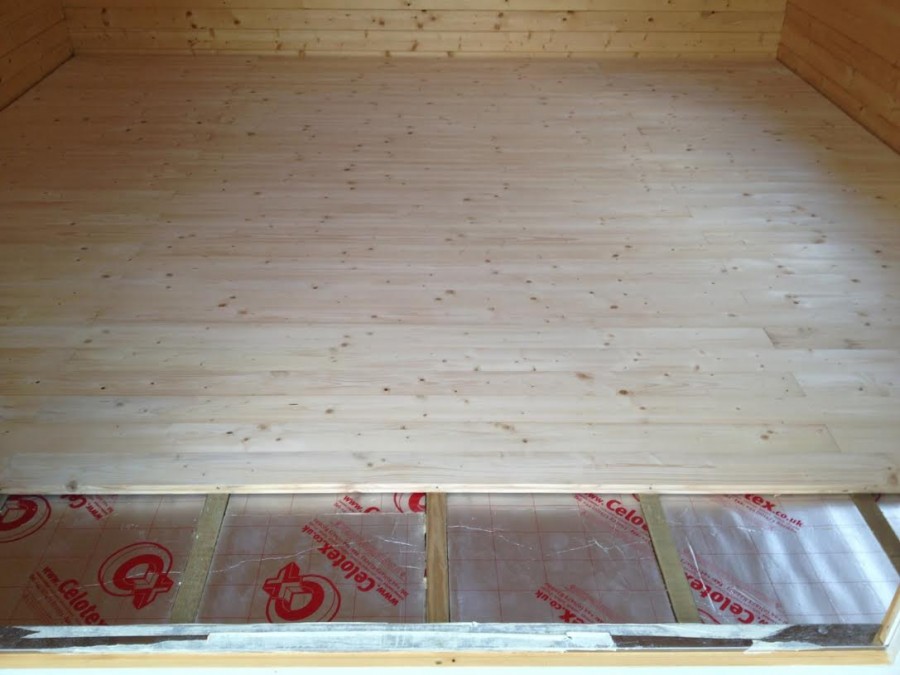 Когда пол будет устелен деревянными лагами, можно приступать к креплению фанеры. Она будет укладываться в два слоя. Первый слой крепится при помощи шурупов к лагам, а второй насаживается сверху на первый при помощи клея. Такой двухслойный вариант обеспечит долговечность пола.