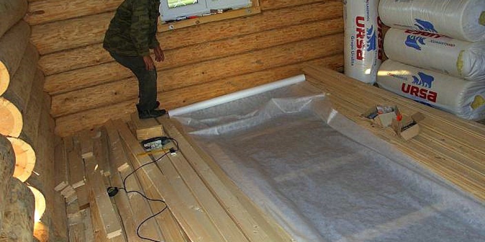После этого в шахматном порядке укладывают минералловатных плиты, а сверху сплошной слой пароизоляции, который накрывает лаги и фиксируется при помощи строительного степлера. Шов пароизоляции проклеивают скотчем.