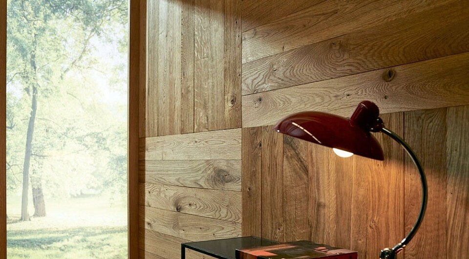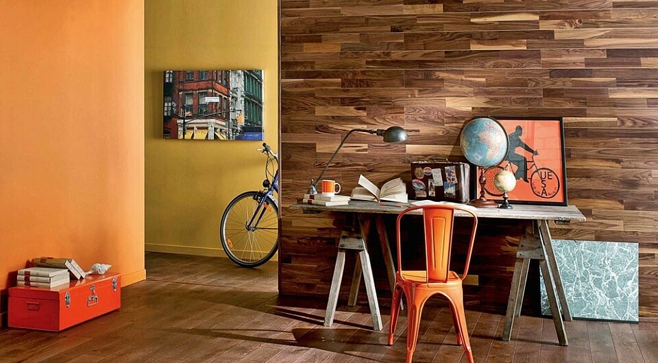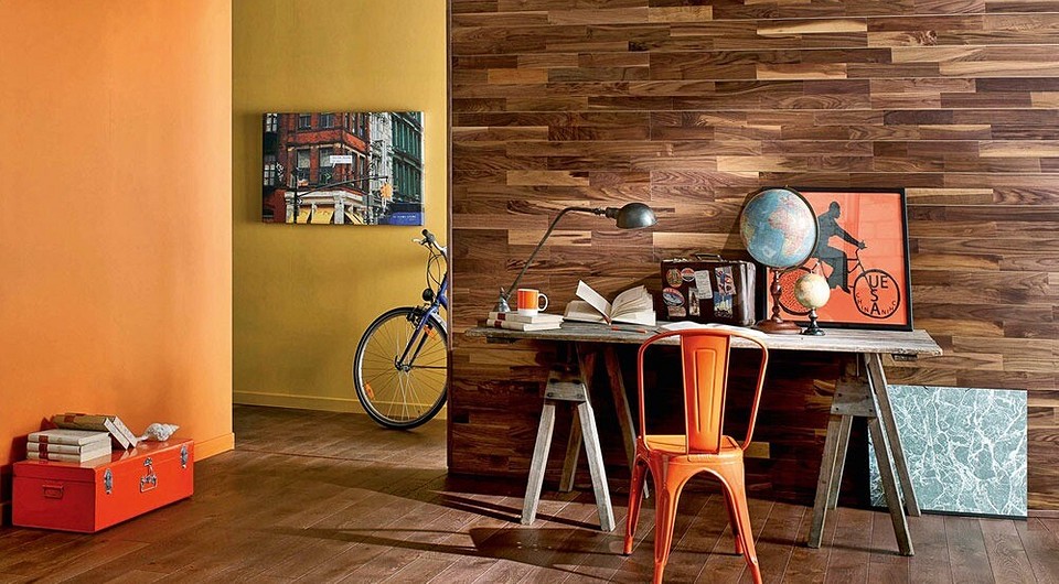 На стене доски не нуждаются в такой же надёжной защите от истирания, как на полу. Поэтому подойдут изделия с верхним слоем из любых пород дерева, в том числе средней и низкой твёрдости: вишня, груша, ольха, берёза, которые не слишком практичны на полах. Составы для обработки поверхности дерева (лак, масло, масло-воск) тоже рассматривают с точки зрения дизайна. В одних интерьерах, например, на кухне, предпочтительнее доски с эффектным и ярким глянцевым лаком, а в спальне или гостиной — с бесцветным маслом, которое создаёт впечатление натуральной необработанной древесины.