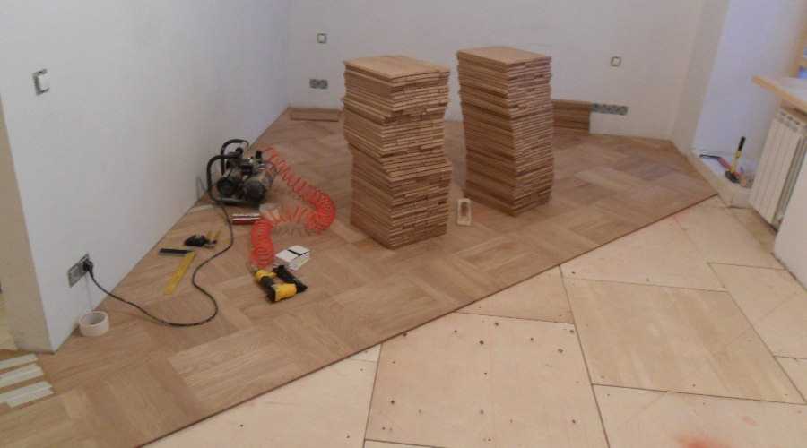 На сухое ровное основание настилают фанеру. Ее толщина должна быть не менее 2/3 от толщины досок паркета. Это значит, что если паркет толщиной 15 мм, фанера не должна быть тоньше 10 мм, при толщине паркетных плашек 22 мм, фанера нужна 14,5 мм или больше.