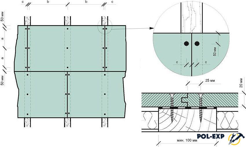 На лаги укладывают 2 слоя плит с зазором между ними 3 мм, а между плитой и стенкой – 12 мм. Стыки слоев не должны совпадать. Короткие кромки листов стыкуют на опорных лагах – стыки располагаются посередине. Для улучшения контакта поверхность обрабатывают монтажным клеем. Саморезы вкручивают в плиту к лагам с шагом 150 мм по краю каждой панели.