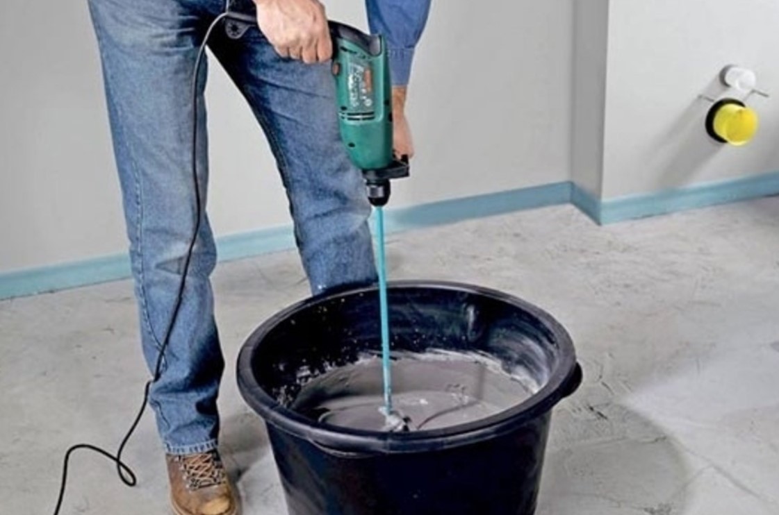 Шаг шестой. Приготовьте смесь для наливного пола, действуя в соответствии с инструкцией производителя, указанной на упаковке. Чтобы приготовить смесь, вам понадобится подходящая емкость, а также строительный миксер или соответствующая насадка для электродрели.