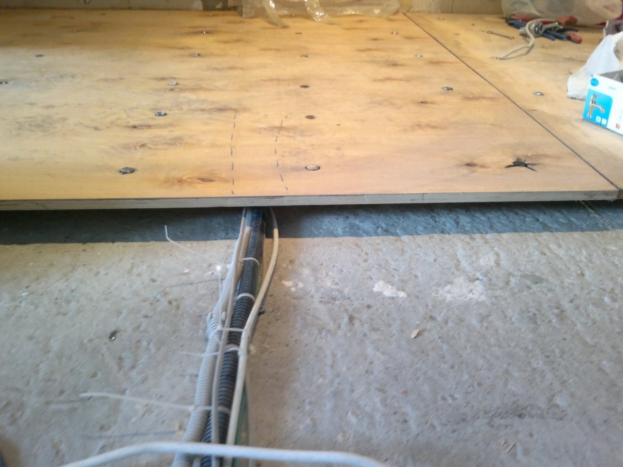 Перед выполнением монтажных работ листы фанеры нужно раскроить и разложить на полу в разбежку, таким образом, чтобы их стыки не были расположены на одной линии.