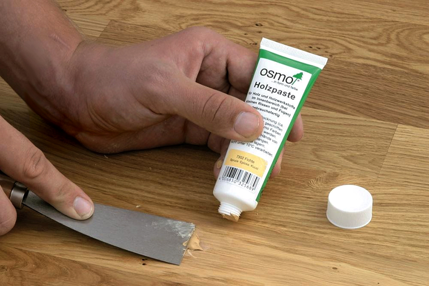 Устраняются повреждения и царапины с досок при помощи косметической шпаклевки, которая наносится посредством обыкновенного тонкого шпателя. Подобрать нужный цвет не составит труда, потому как торговые заведения предлагают широкий выбор материалов.