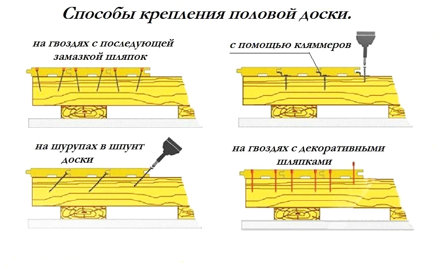 Крепление половой доски гвоздями имеет свою хитрость: они пришиваются к лагам «в ерша». На каждый брус — 2 гвоздя: первый забивается вертикально, второй — под углом. Доски пола должны укладываться с небольшим зазором между ними.