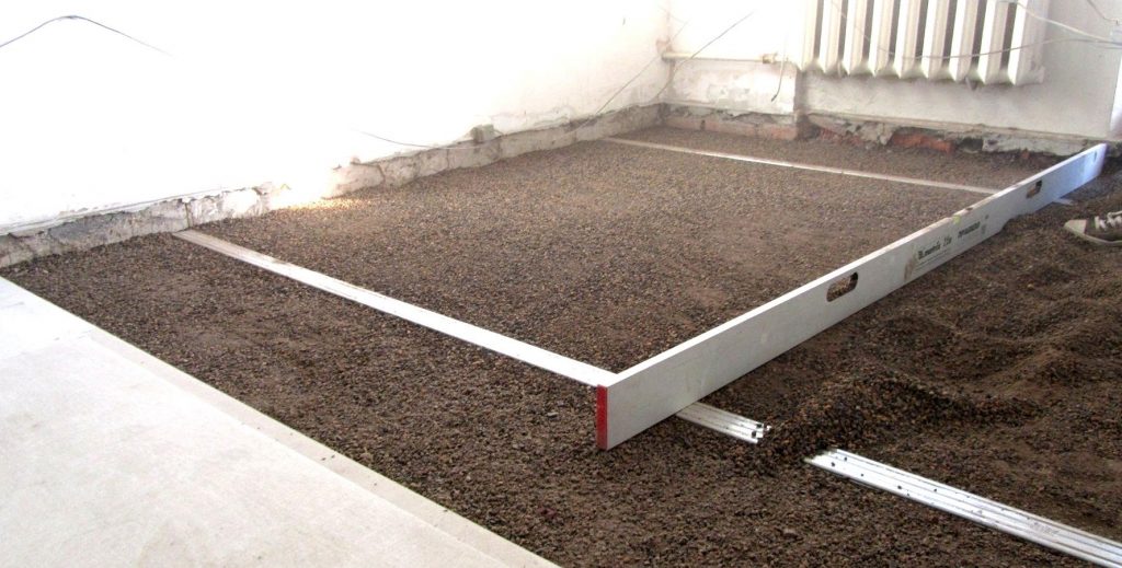 Керамзитовый песок, используемый в технологии Knauf, мелкофракционный. По стандарту размеры его гранул не должны превышать четырех миллиметров. Засыпку выравнивают «по маякам» при помощи правила.