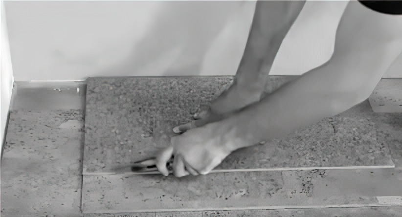 Резать пробку просто — острым лезвием вдоль металлической линейки. Если плитка толстая (есть 4 мм и 6 мм), за один проход разрезается примерно 1/3 толщины. Если срез будет спрятан пол плинтусом, планку поднимаем, перегибаем по линии разреза, она ломается. При необходимости можно помочь себе ножом.