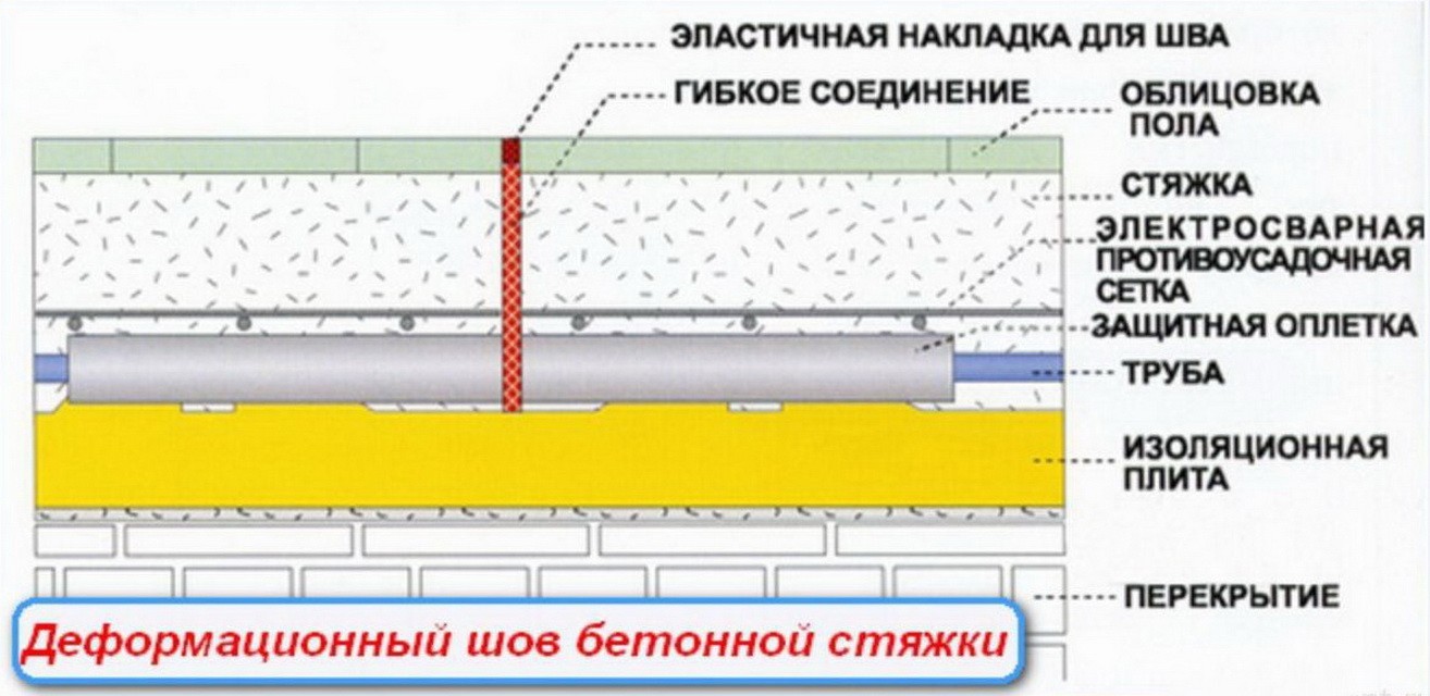 Для оформления стяжек допускается использовать цементно-песчаной смеси на базе портландцемента (минимум М-400, а еще лучше применять М-500). Когда в ход идет готовый бетон, его марка должна быть М-350 и выше. Кроме укладки демпферной ленты, арматурную сетку там, где проходит шов, разделяют. Толщина каждого шва составляет 1 см, а верхнюю долю его обрабатывают герметиком. При прохождении в этих местах труб их следует класть только во внешней гофрированной трубе.