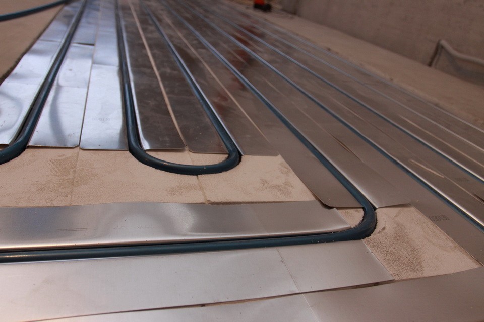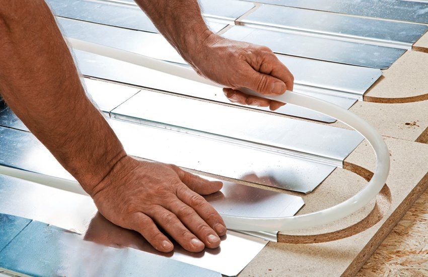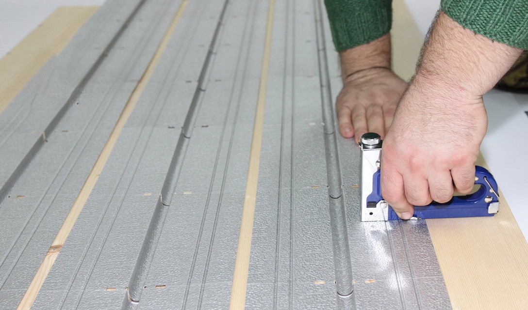Наложение на настил так же подразумевает размещение утеплителя в разрывы лагов поверх гидроизоляции, а выше кладется фанера или черновые доски. Нюанс: обточите доски, чтобы появились каналы для прокладки труб. Отражательный слой делается из фольги, присоединяемой к доскам с использованием скоб. Трубы в каналах удерживаются поставленными сверху узкими пластинами из металла, сами пластины тоже прикрепляются к доскам.